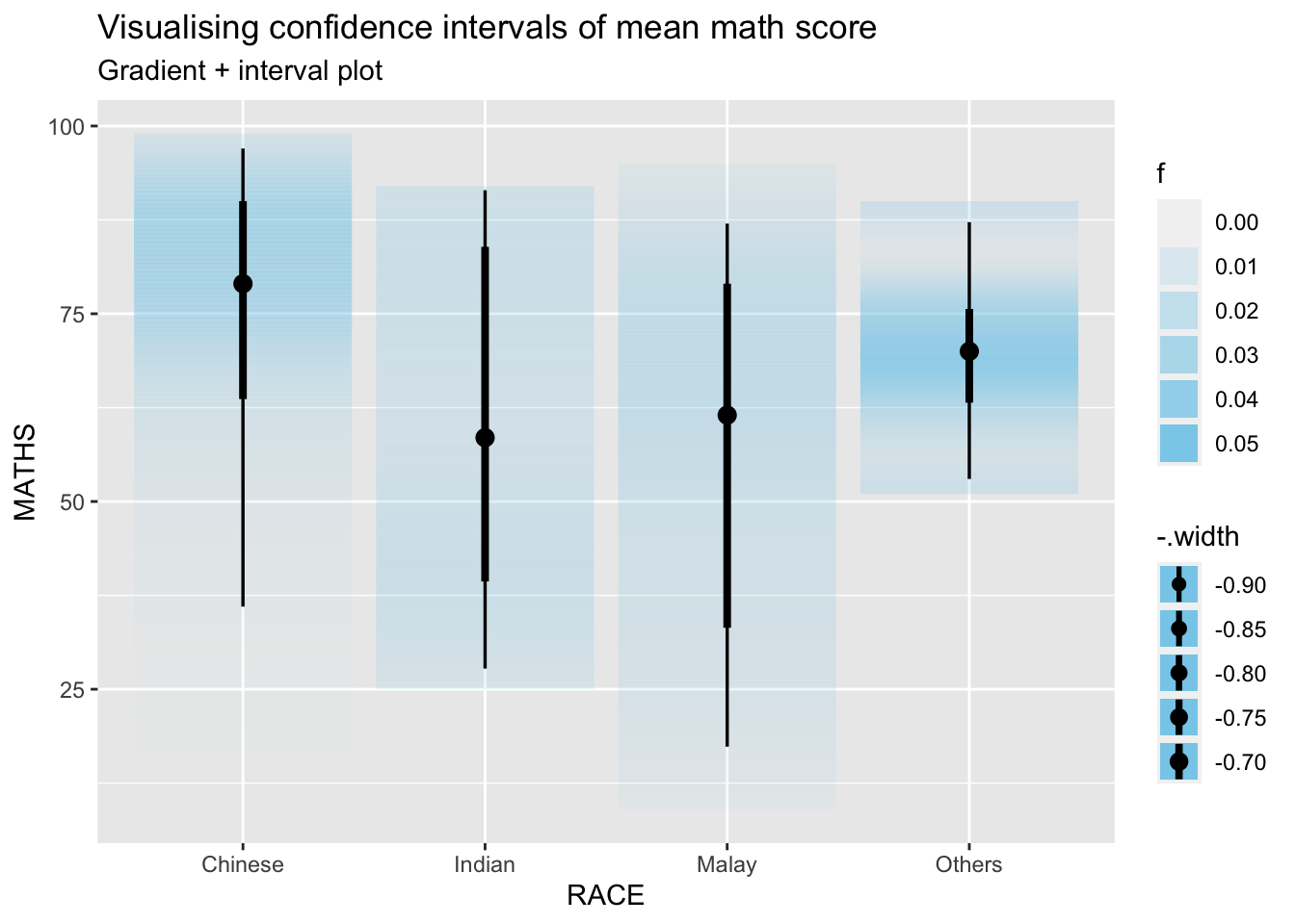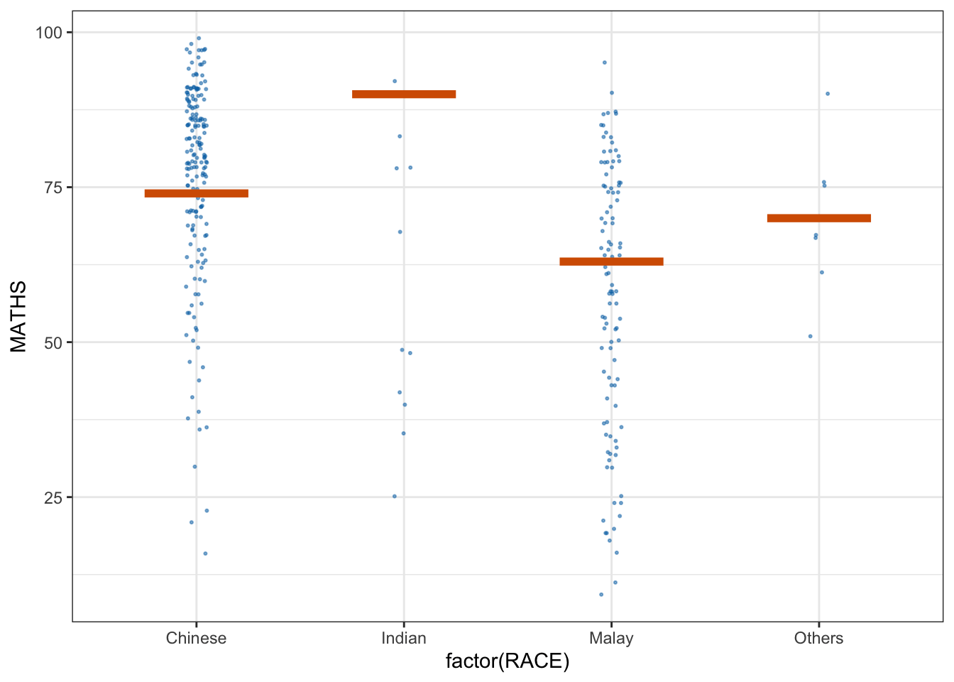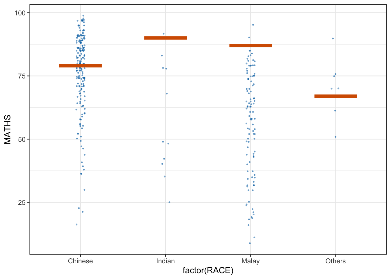 library(ungeviz)ggplot(data = exam, aes(x = factor(RACE), y = MATHS)) +