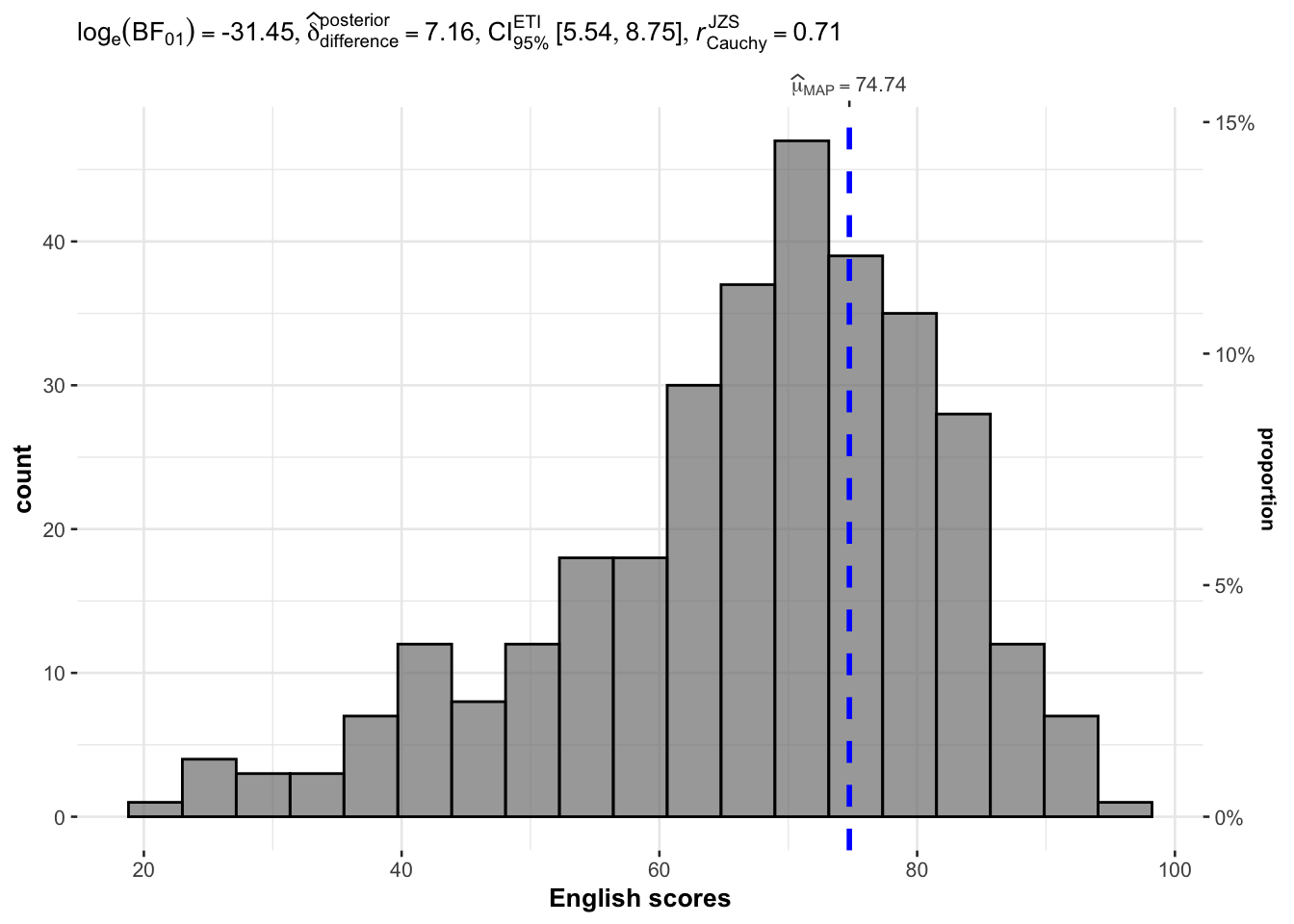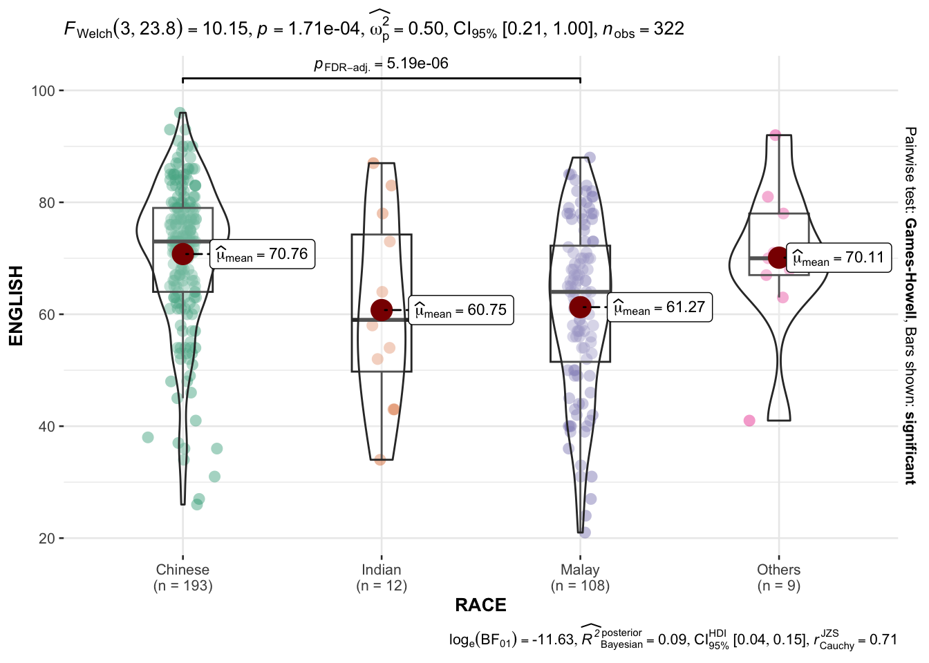gghistostats with bayes on ENGLISH and test value 60