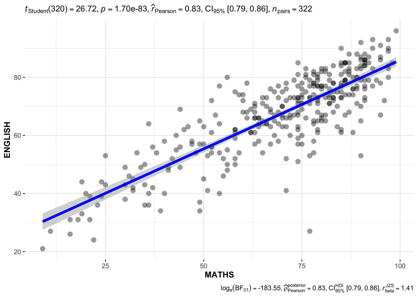 ggscatterstats method on MATHS and ENGLISH