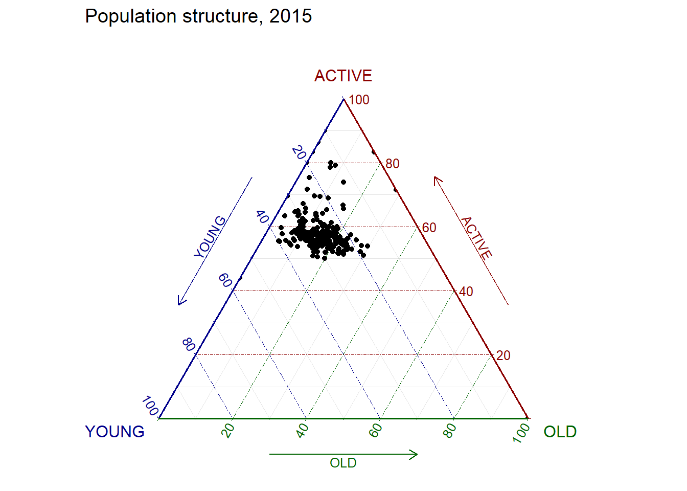 filter(TOTAL > 0)ggtern(data=agpop_mutated,aes(x=YOUNG,y=ACTIVE, z=OLD)) +