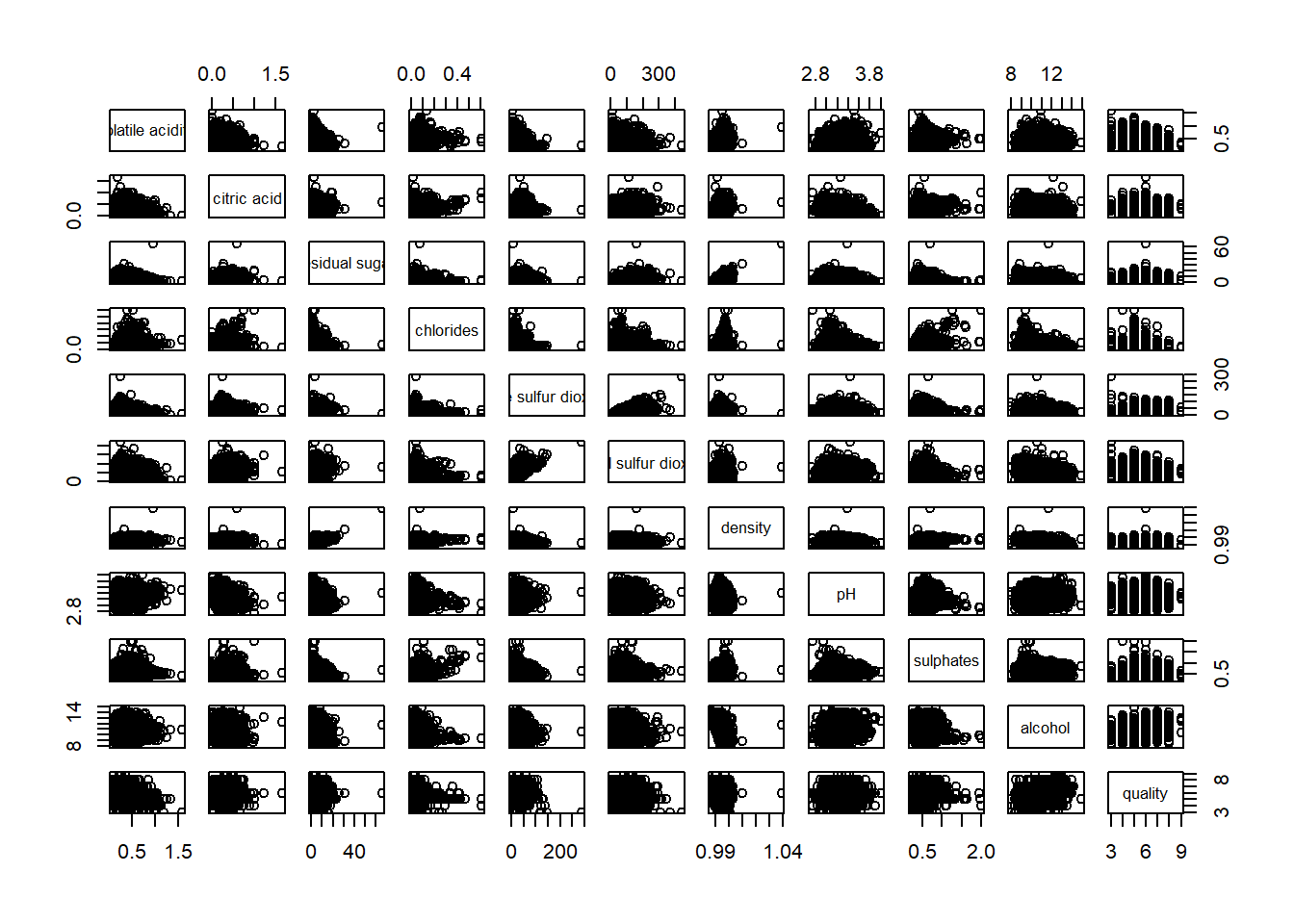 wine <- read_csv("../data/wine_quality.csv", show_col_types = FALSE)pairs(wine[,2:12])