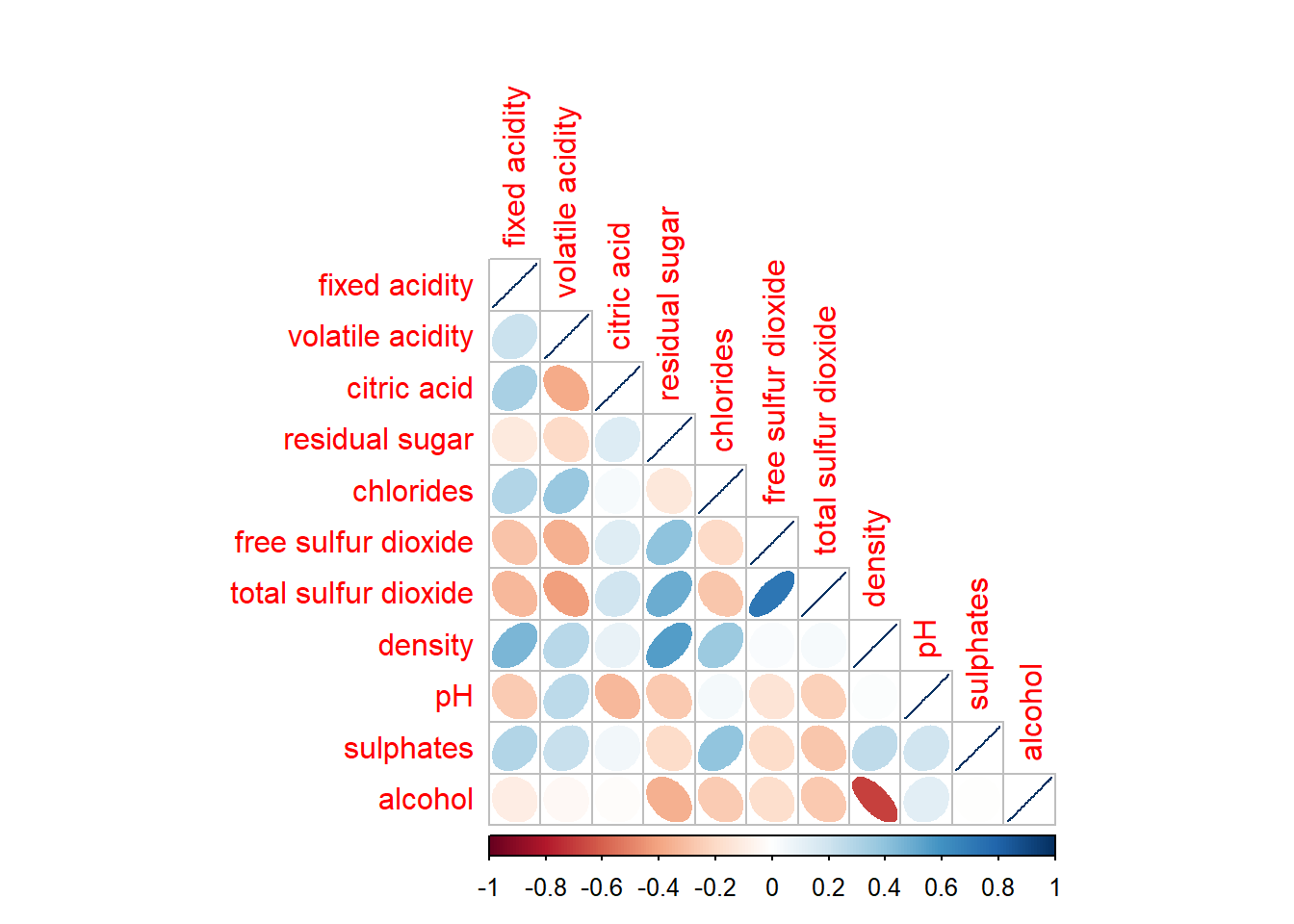 wine.cor <- cor(wine[, 1:11])corrplot(wine.cor,
